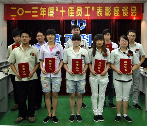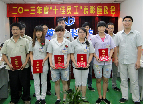 2013年7月23日下午一點整,公司培訓室里人員濟濟一堂,正在召開的2013年度“十佳員工”表彰座談會,不時掌聲陣陣。會議由行政保密部經(jīng)理葉秀華主持,參加座談會的有2013年度“十佳員工”及“表揚人員”,各部門課長以上人員。出席本次表彰座談會的嘉賓有公司副總經(jīng)理王德瑜、總經(jīng)理助理徐正保、工會主席丁麗敏和婦代會主席倉瑋。