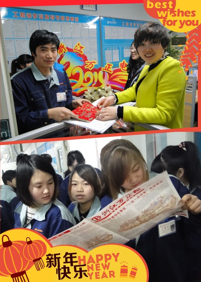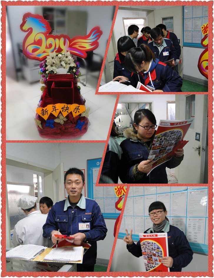 二零一四年一月十六日下午一點整,一輛花朵盛開、彩蝶飛舞的“馬年”小推車緩緩地推入了公司的車間,它散發著新春惹人愉悅的氣息,裝載著公司對全體員工們深深的新年祝福。這是萬正公司給員工現場送紅包了!喜聞喜訊的員工們帶著微笑,踏著輕快的步伐,紛紛前來領取新年紅包。今年正值公司成立十周年,因此除了新年紅包,公司更給員工們發放了工齡獎紅包,以感謝為公司十年發展作出貢獻的員工們!大家感受著公司祝福,愉悅的心情溢于言表。同時,公司為員工們送上新年特刊---《浙江萬正報》,看著大家宣讀著2013年度公司“一優一兵四星”的先進事跡,看著他們在“萬正之家”中尋找自己的笑臉而不時露出的微笑,身在其中的我不得不被這其樂融融的氛圍所感染。