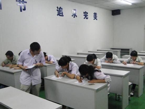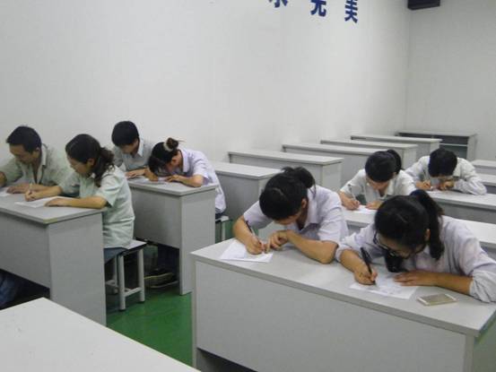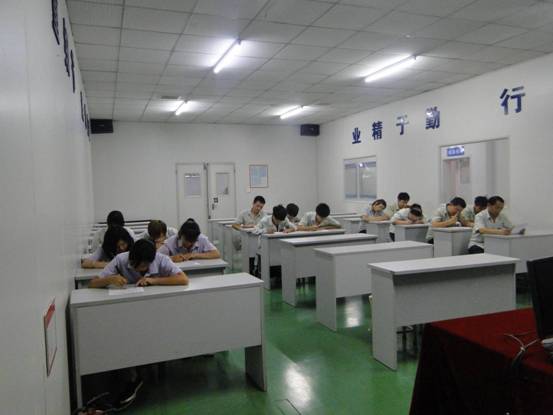 二O一四年七月十八日晚五點,公司生產區培訓室里員工們低頭奮筆疾書,這里正在進行一場“二O一四年上半年度組長、高級工質量知識考核”。參加人員共為37名,分別為高級工18名,組長19名。