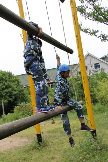在天梯的項(xiàng)目中,必須兩人一組才能完成任務(wù),教練的要求必須男女搭配,因隊(duì)伍中陽(yáng)盛陰衰,所以教練明確不能有兩位女隊(duì)友一起組合。在本項(xiàng)目中,天梯共5層,達(dá)到3層算合格。經(jīng)過(guò)較好的合作,任務(wù)完成較好,甚至有多組達(dá)到了4層、5層。在這過(guò)程中,部份男隊(duì)友為了展現(xiàn)男兒本色,第一層想獨(dú)立上去,結(jié)果以慘敗告終;部份男隊(duì)友,高估了“野狼”力量,在上天梯時(shí)怕女隊(duì)友柔弱的身體支撐不住,而不敢從女隊(duì)友身上借太多的力,結(jié)果能上4層的只能達(dá)到3層,能上3層的只能達(dá)到2層。