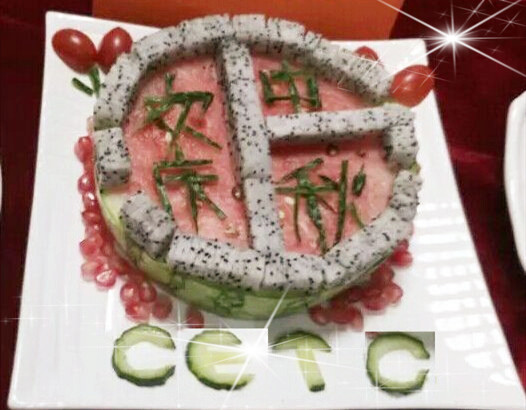 利用我們前期所想的水果材料,創(chuàng)意拼盤開始了,我們一致采用了隊員宋次秋的想法:愛廠如愛家,以“萬正是我家”的理念,把自己融入到大家庭中來,為公司獻(xiàn)上一份特別的禮物。于是,我們開始制作萬正Logo 圖標(biāo),并寫上中秋佳節(jié)祝福語,“歡慶中秋”字樣。首先,我們先用刀截取了一層西瓜做為圖標(biāo)的外形,然后,再采用火龍果做為圖標(biāo)的造型設(shè)計,接著采用黃瓜皮拼出“歡慶中秋”四個字,再圍繞著圖標(biāo)用石榴包圍一圈,最后放上英文字目“CCTE中國制造”四個英文字目。瞬間,我們的作品《萬正之家》誕生了,真美!