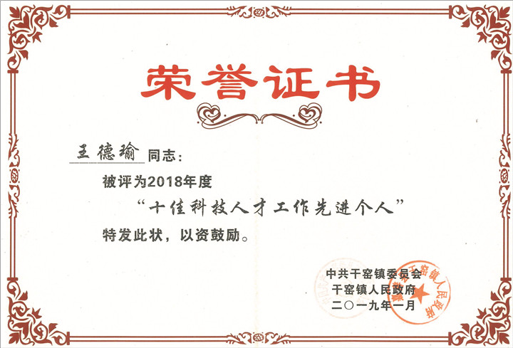 熱烈祝賀公司王德瑜同志被中共干窯鎮委員會授予2018年度“十佳科技人才工作先進個人”光榮稱號